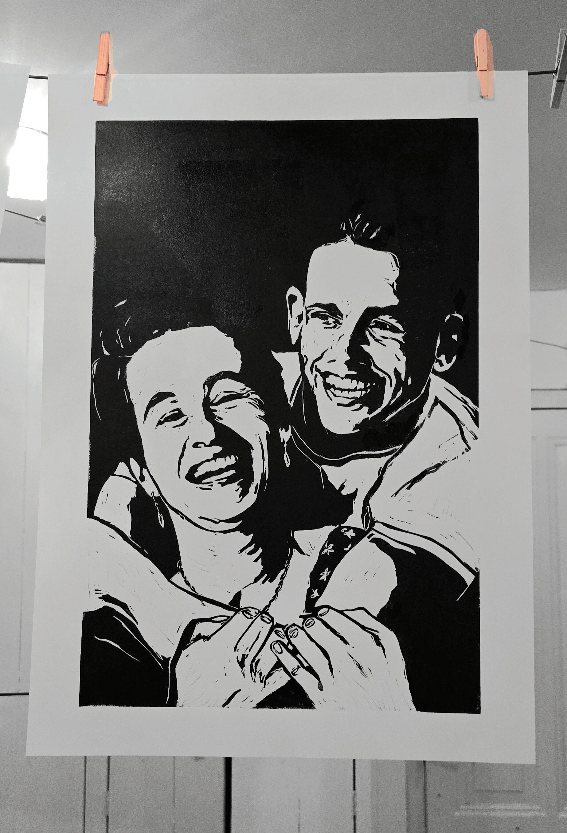 Ik maak portretten in linosnede, waarbij ik met zorg en precisie werk aan de kracht van lijn, contrast en karakter. In elk gezicht zoek ik naar een verhaal dat verder gaat dan de uiterlijke gelijkenis.